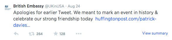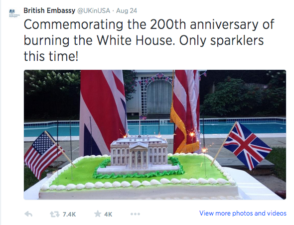One of the courses I am teaching this year is The History of US Foreign Policy. The curriculum for the course begins with the Seven Years’ War and continues up to the present. Since we’re going to eventually talk about current US foreign policy, one of my goals is to incorporate digital diplomacy and talk about how the US State Department and other diplomats, embassies, and ministries of foreign affairs use social media as a tool. To give my students a taste of what that might look like, during our unit on the War of 1812, I showed them the following tweet from the British Embassy to the US–